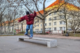 Extra langes Flatrail und slicke Granit-Bench als effektive Upgrades des veralteten Skateparks. Kleine Maßnahme – enorme Wirkung!